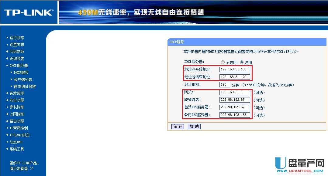 依次点击“DHCP服务器”、“DHCP服务”,设置地址池开始地址、结束地址,这是以后二级路由分配给你的设备的IP,根据“一级路由自动分配IP情况”设置网关、主DNS服务器、备用DNS服务器,一定要与一级路由器的设置相同,“保存”并“重启”路由器。