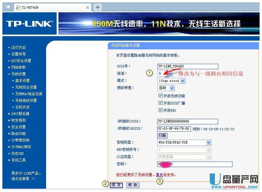 根据提示选择与一级路由器相同的信道,“重启”。