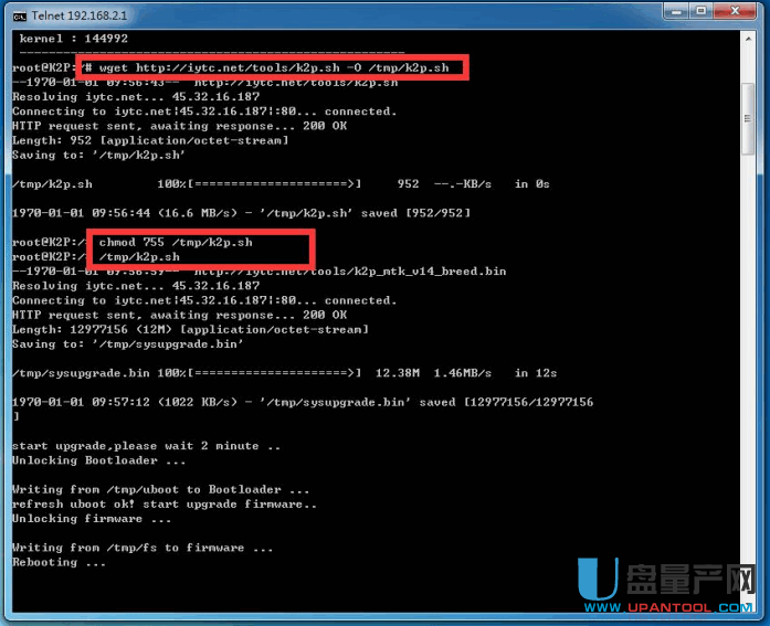 完成【二-2)】时路由器已经处于联网状态,请使用PC访问百度确认一下,如果不能联网请想办法百度搜索K2P上网指南。使路由器处于联网状态后,用windows telnet登录k2p,执行: