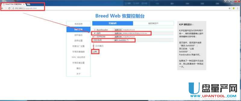 完成步骤四后K2P中会刷入breed,breed默认IP是192.168.1.1,请使用浏览器登录breed的WEB管理页面刷第三方固件包,操作如下。