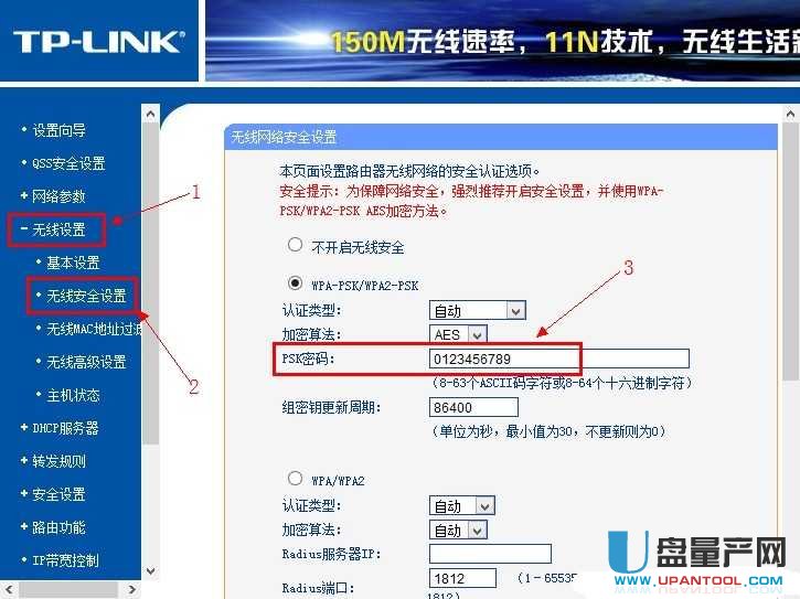 1、依然是浏览器输入192.168.1.1,然后输入用户名和密码,然后在设置界面里点击-无线设置-无线安全设置,然后就能看到wifi密码设置界面了,直接选择wap-psk/wpa2-psk,看到psk密码就是wifi密码了,设置一个你自己认为好记且稍微复杂的密码。