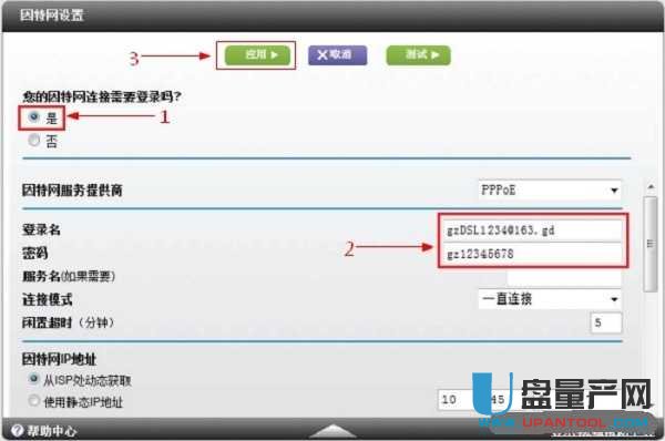 然后在“因特网服务提供商”选择PPPoE>在“登录”和“密码”后面的空白栏中分别输入:宽带的帐号、宽带密码
