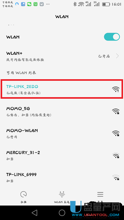2、手机上打开wlan设置,找到路由器的默认wifi地址,这里的是tplink路由器所以地址是tp-link_2edd,大家可以根据看看哪个信号最强且无需密码的就是你的路由器wifi默认名字了,点击连接上。
