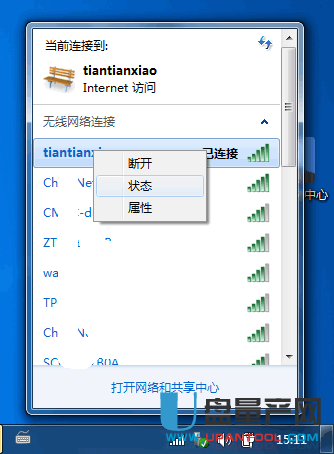 2、查看笔记本或者台式电脑上的有线或者无线网络分配的ip地址网关是多少,这里因为是用wifi连接的网络,所以方法是点击右下角的无线网络图标,然后点击已连接的wifi名称,鼠标右键点后在菜单里点击状态