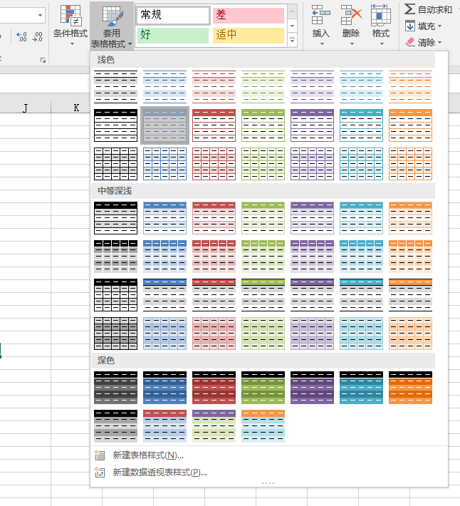 2、然后选出一个自己喜欢的表格样式,如下图有比较多的选择,分成了浅色系,中等深度,深色系,大家按自己的喜好选就行了。