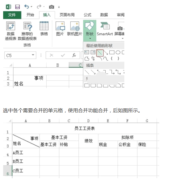 6、第一列的第二行和第三行合并,用合并单元格居左,然后填入两个表格的表头名,两个用回车换行,上面的用空格让其文字移动到右边一点,再用工具栏的<插入>,点击【形状】,选择直线,然后将直线按对角拉出一条线就可以了,其他的项目用合并单元格功能就能实现。