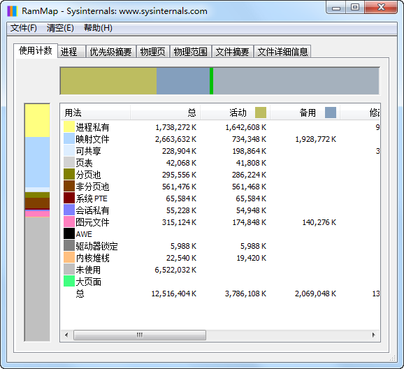 RAMMap是一个先进的物理内存空间分析工具,比较专业的内存分析器,也就是说电脑分配了哪些程序驻入内存我们可以用本工具来查看到,主要功能就是用于开发程序的时候用到。