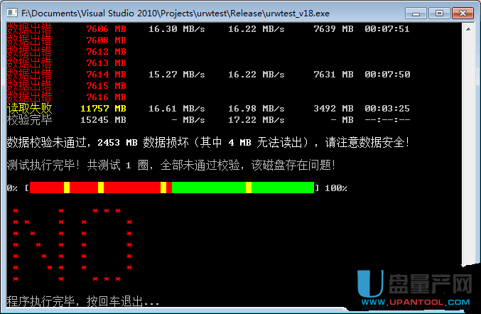 urwtest 是U盘爱好者自己制作的无毒绿色环保软件,主要功能是检测U盘是否被扩容,检测U盘实际容量,如果你用mydisktest检测是没有扩容其实不算准确,因为现在的js会专门针对mydisktest的测试做手脚,所以你需要这个urwtest来检测你的U盘或者内存卡,它是基于dos机器级别的测试,所以很准确,一般U盘,任意内存卡用它对是不是动过手脚是很准确的。