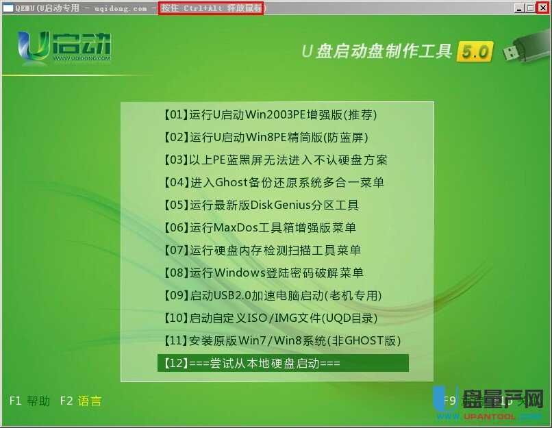 如上图所示为电脑模拟器测试启动u盘的界面,我们可以按上下键选择下即可,不用做其他操作,测试完毕后我们同时按下“ctrl”+“alt‘组合键即可释放鼠标到电脑桌面,然后关闭电脑模拟器窗口,最后再关闭u启动主程序即可。