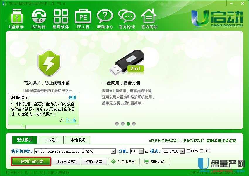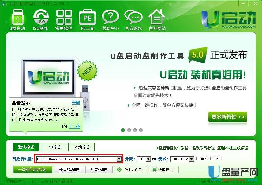 第二步:如上图所示,小编标注的红色框内,提示“请先插入需要制作启动盘的u盘”,那么我们就插入我们事先准备的u盘。(注意事项:1.为了保证制作过程中数据传输的顺畅,请将u盘插入到电脑主机箱后置的USB插口处,如果是笔记本的话则任意插入任何的USB插口。)下图为插入u盘后u启动自动识别到u盘的详细信息: