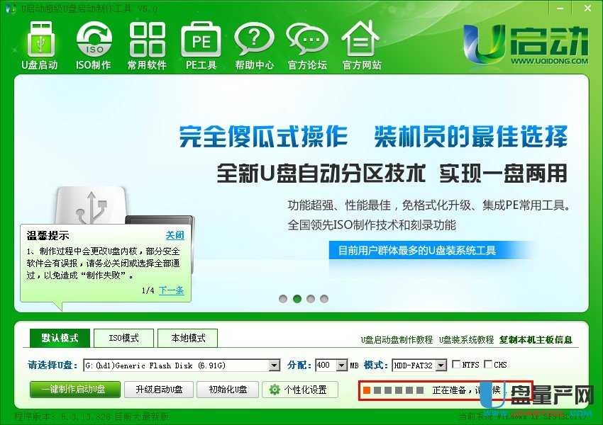 第四步:如上图所示,我们点击了“确定”按钮以后,需要做的是耐心等待其制作完成,制作过程包括:“数据准备” → “格式化u盘” → “写入数据” → “制作完成后自动拔插u盘”。这些过程都是全自动的,无需人工干预和操作,所以我们在此过程中请尽量避免不做其他无关的操作,以免制作失败,直到启动u盘制作成功。如下面四张图所示为整个制作的过程:(整个过程大概需要1-2分钟的时间,刚开始制作的时候可能会出现假死状态,大家无需担心,只需等待即可)