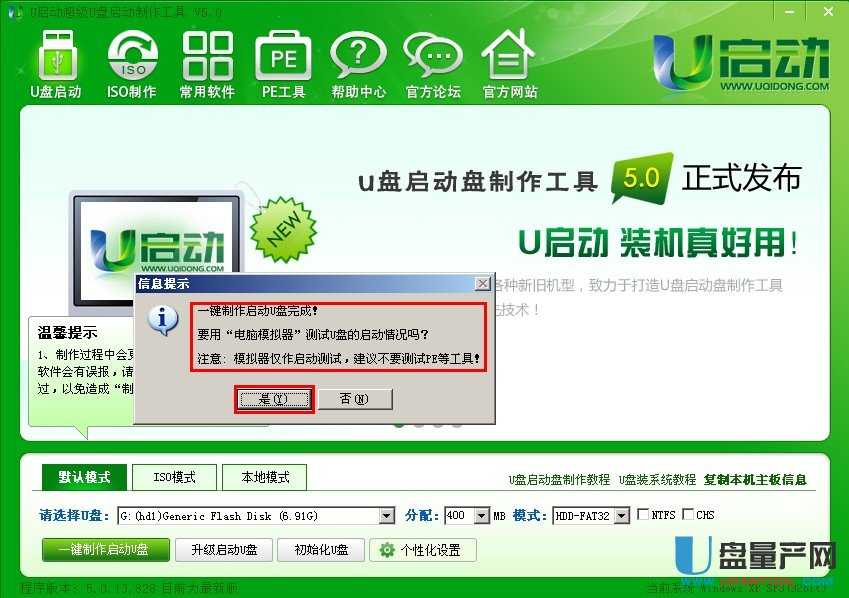 第五步:当制作成功并自动拔插了u盘以后会弹出一个窗口,该窗口为让您测试u盘启动盘是否制作成功的选择框,大家可以点击“是(Y)”按钮来测试u盘是否已经成功制作u盘启动盘了。如果觉得没必要,那我们可以点击“否(N)”,然后关闭u启动软件即可。如下图所示:
