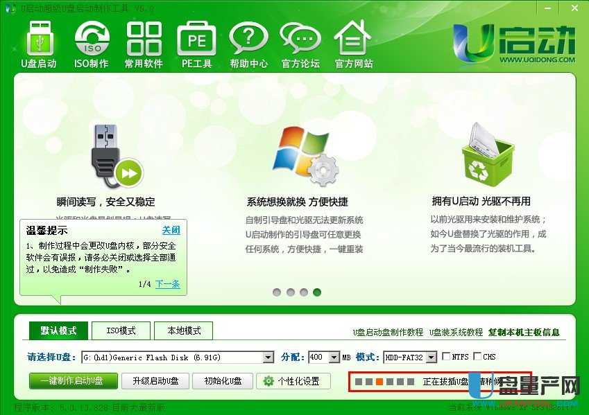 上图所示为制作u盘启动盘成功后u启动软件正在为您拔插u盘,也就是自动弹出u盘再插入u盘的意思。(因为制作好启动u盘后需要拔插一次才能检测出是否制作成功)