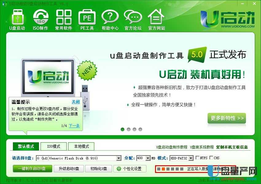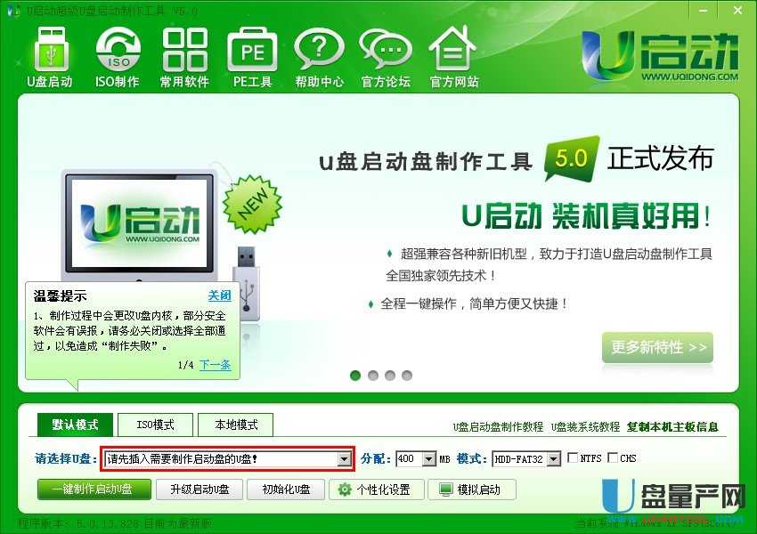 第一步:运行已经安装在电脑本地的u启动u盘启动盘制作工具v5.0版本,如下图所示: