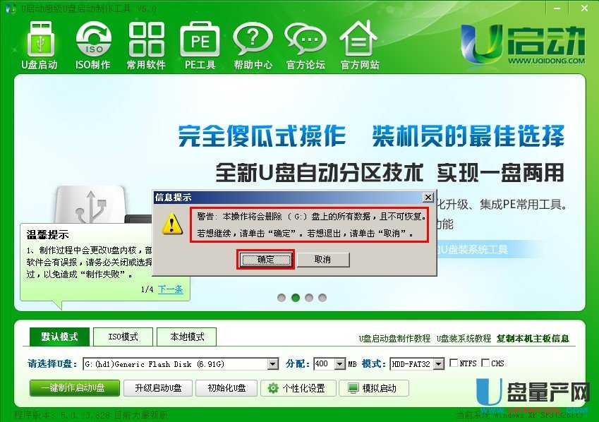 如上图所示,当点击了一键制作启动u盘按钮后,弹出一个警告窗口,其警告的内容就是告诉您制作u盘启动会格式化u盘,u盘里面的数据将全部清空,让您确认u盘里面没有保存重要的数据后再点“确定”按钮开始制作,如果您还有重要的文件数据在u盘里面没有拷贝出来的话,那么我们点击“取消”按钮,然后先把u盘里面的文件跟数据先复制到电脑其他磁盘里面后再制作启动u盘。如下图所示:
