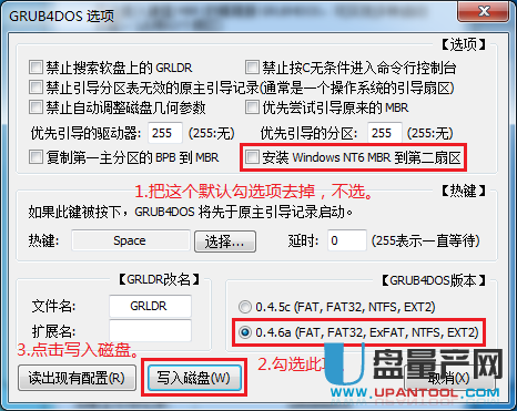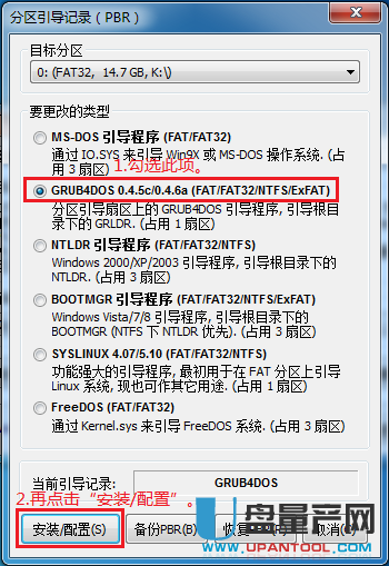 然后分两步走:第一先把grub4dos0.4.6a的“主引导记录”写入U盘或移动硬盘,第二步把grub4dos0.4.6a的“分区引导记录”写入U盘或移动硬盘的32G的FAT32格式的主分区——“PE与维护性工具软件的专用分区”: