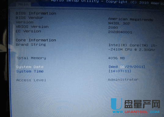 电脑重启,开机的时候一直按键盘上“F2”键,进入bios首先看见的是main选项卡。该界面显示了一台笔记本的一些基本信息