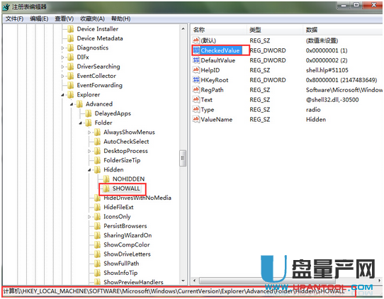 HKEY_LOCAL_MACHINE→Software→Microsoft→Windows→CurrentVersion→explorer→Advan,接着双击打开右侧窗口中的“CheckedValue”文件,如图所示: