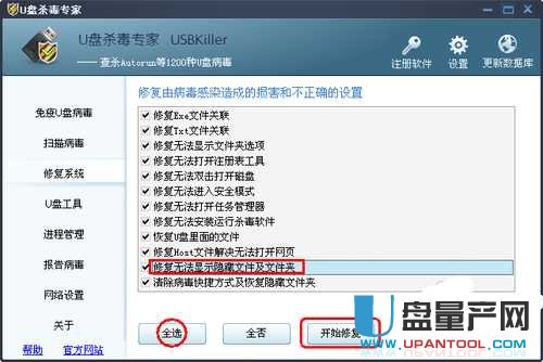 我们下载好 u盘杀毒专家,点击U盘杀毒专家左侧界面的“修复系统”,选择 “修复无法显示隐藏文件或文件夹”选项,也可以全都选上,再点击“开始修复”就可以了。