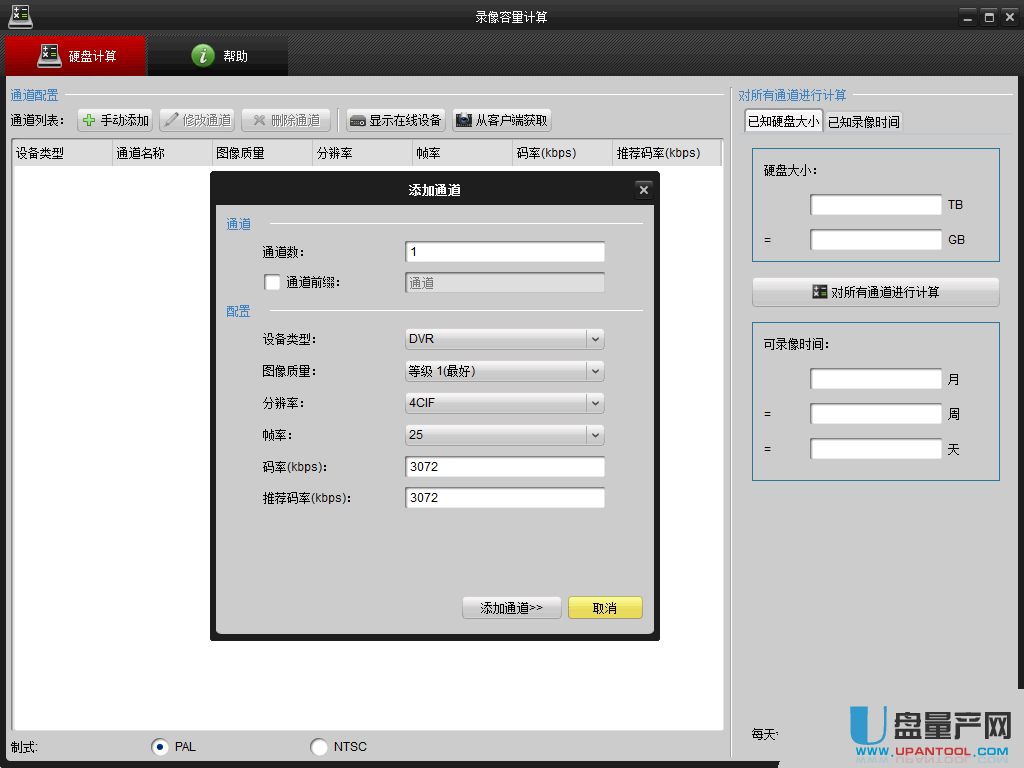 录像工具最先考虑的是存储量,这样才能计算好可以一直录像多少天,所以这个工具就是为了计算存储容量和录像天数比例的工具,用于计算在指定的录像压缩参数下,保存指定天数的录像所需要的磁盘容量。根据实际情况添加通道数,并配置好各通道的图像质量及分辨率帧率码率。对所有通道进行计算,得出可用录像时间。