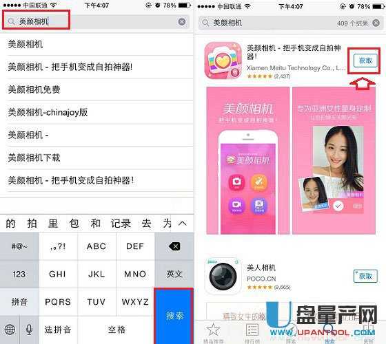 3、如果觉得很多应用找不到的话,别着急,点击底部的【搜索】,然后输入需要下载的软件名称即可,如搜索“美颜相机”,之后就可以找到这个软件,如下图所示。