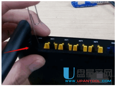 1、首先先把路由器的电源拔掉,然后用牙签或者圆珠笔尖通过RESET小孔按住里面的开关不放;