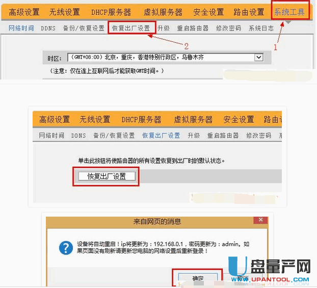点击“系统工具”--->点击“恢复出厂设置”--->点击下面的“恢复出厂设置”--->在弹出的提示对话框中点击“确定”,重启后就把腾达路由器恢复到出厂时的配置了.
