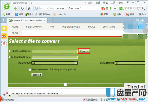 用浏览器打开上面的网址,会看到一个选择文件进行转换的绿色方框,也就是“Select a file to convert”,我们现在单击“Choose a local file”框右侧的“Browse”按钮,来选择一个需要转换的本地文件。