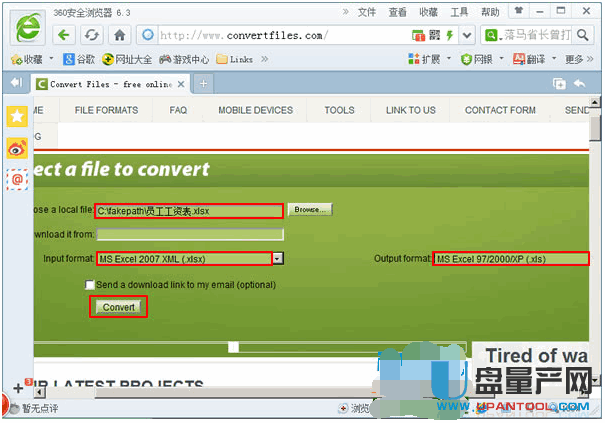 返回浏览器,大家会看到我们选择的文件已经出现在了“Choose a local file”框中,而下面的输入格式框中默认填写的是“MS Excel 2007XML(.xlsx)”,输出格式框中默认填写的是“MS Excel 97/2000/XP(.xls)”,是我们需要的准换格式,我们只需单击“Convert”按钮进行转换即可。