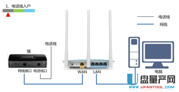 电话线上网:用户需要准备2根网线,一根网线用来连接ADSL Moden与路由器的WAN接口;另一根网线用来连接计算机与路由器的LAN接口(1/2/3/4中的任意一个都可以)。