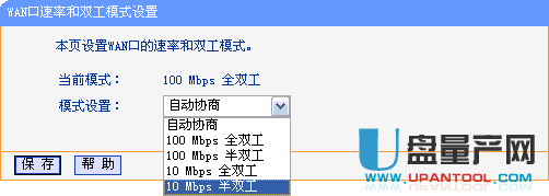 6、登录路由器管理界面,点击 网络参数 >> WAN口速率模式,模式设置中选择10Mbps半双工 或10Mbps全双工模式,点击 保存。