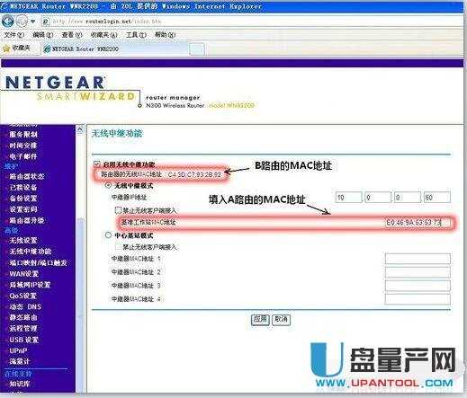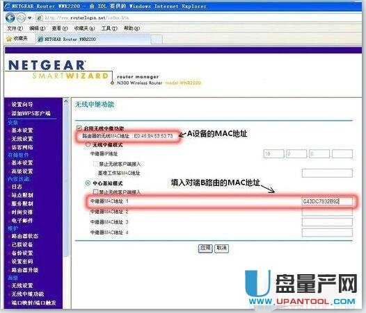 在无线路由器A管理界面,点击左侧菜单中的高级->无线中继功能,设置中继: